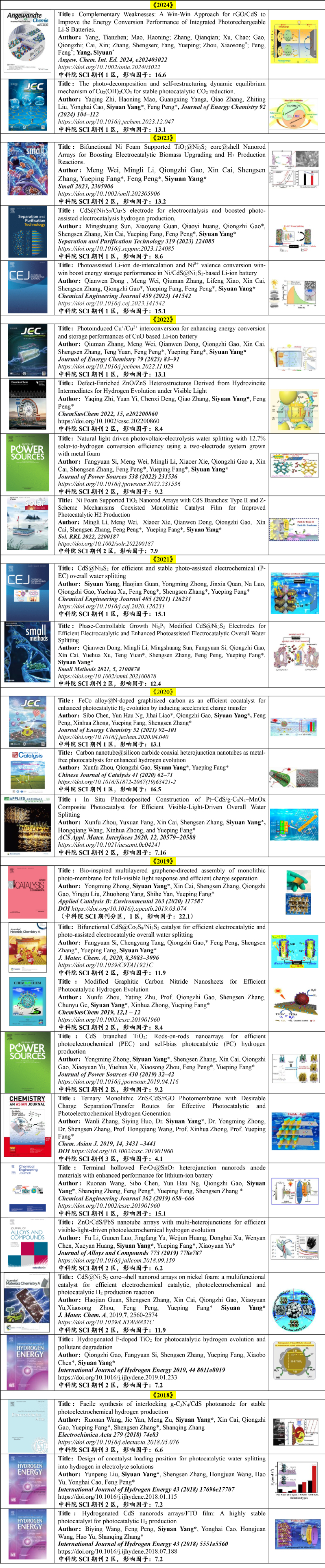 1. Siyuan Yang, Yueping Fang, Feng Peng et al., photorechargeable battery, the 1st international conference on intelligent materials and green electrochemistry, Dec 14-17, 2023, Guangzhou China, The Best Report Award.