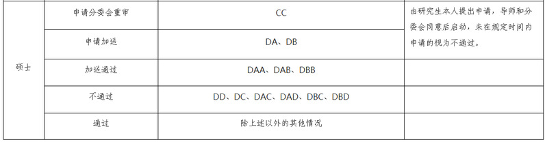 其中硕士学位论文匿名评审结果为“CC”的,经研究生本人申请、导师和学院分委会同意,可申请分委会重审,重审步骤和要求由各学院自定并报研究生院备案;硕士学位论文匿名评审结果为“DA”或“DB”的,经研究生本人申请、导师和学院分委会同意,可申请继续加送1份,不得修改论文,不得继续送审原评审专家。